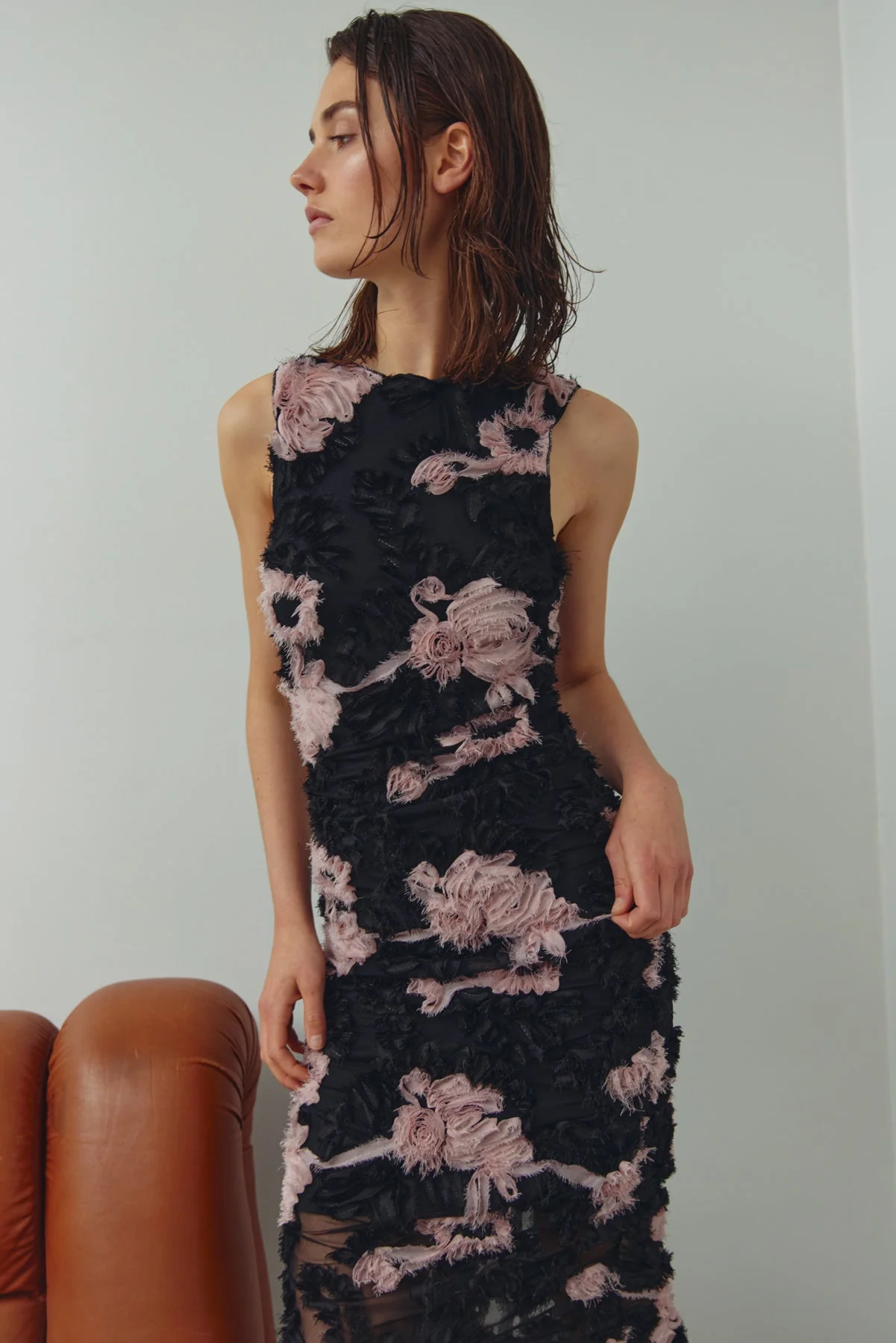 € 125,-Lavinia Dress is een lange, mouwloze jurk met delicate plooidetails die de aansluitende silhouet benadrukken, terwijl contrasterende bloemapplicaties een decoratief accent geven. De combinatie van textuur en structuur creëert een opvallende look die vrouwelijk en modern is. Pasvorm: Slim Fit. Model 179 draagt S