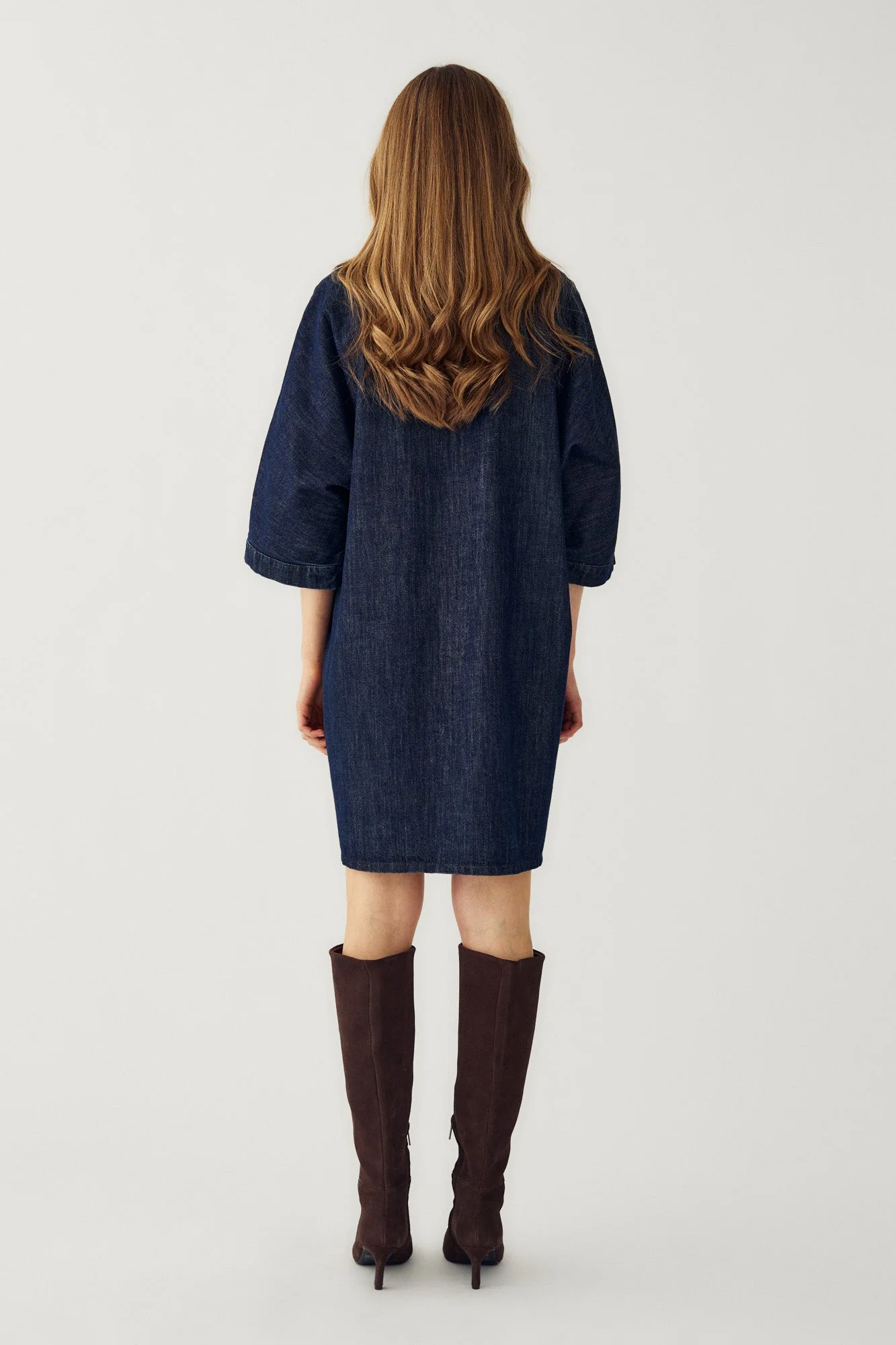 Dress is gemaakt van licht denim. Deze losse, korte shirtjurk heeft een knoopsluiting aan de voorkant, een klassieke kraag en een borstzak. Pasvorm: Loose Fit