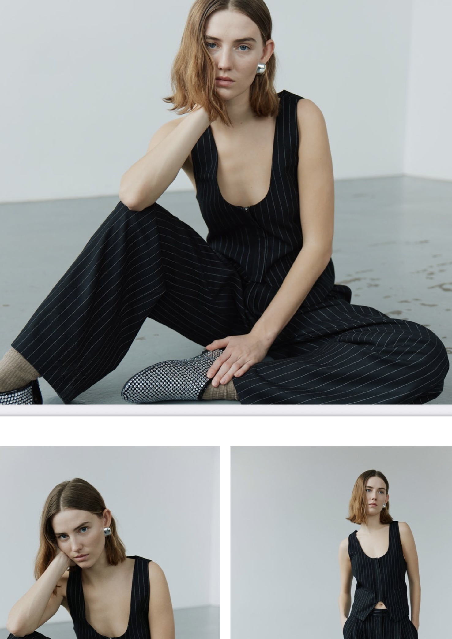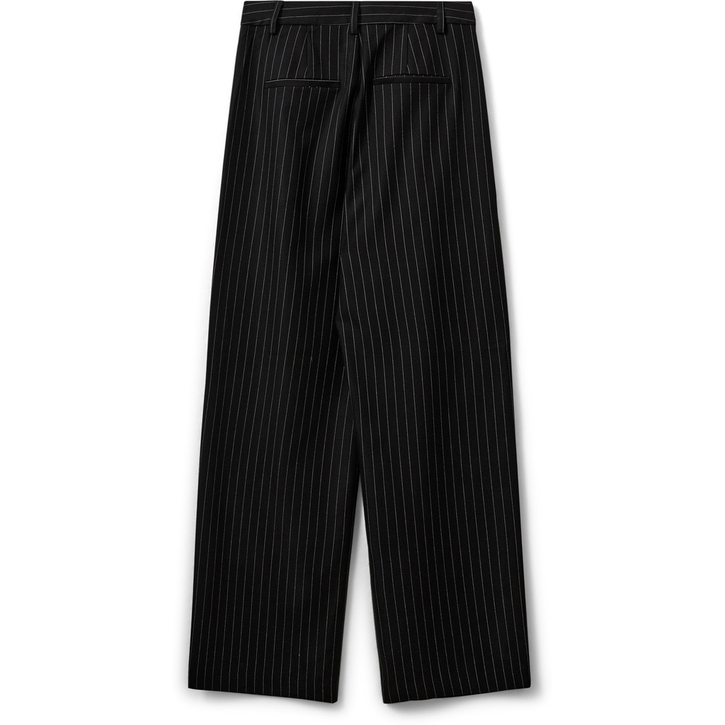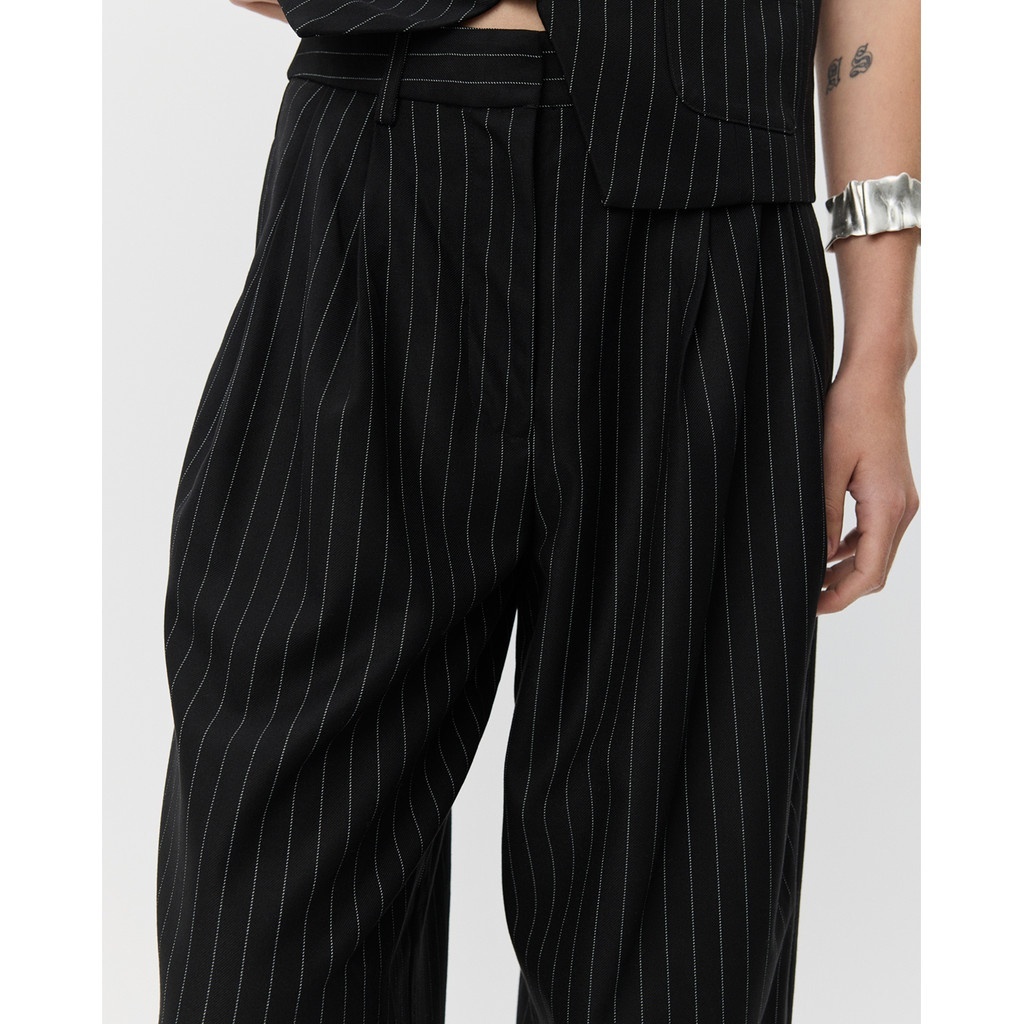 Classic suit trousers with pinstripe print. • Straight trouser legs with width with pleats • High-waist • Zipper and button closure, as well as hook closure • Slanted pockets • Welt decorative pockets at the back • Pleats on the front • Belt loops • The model is 177cm and wears a size S
