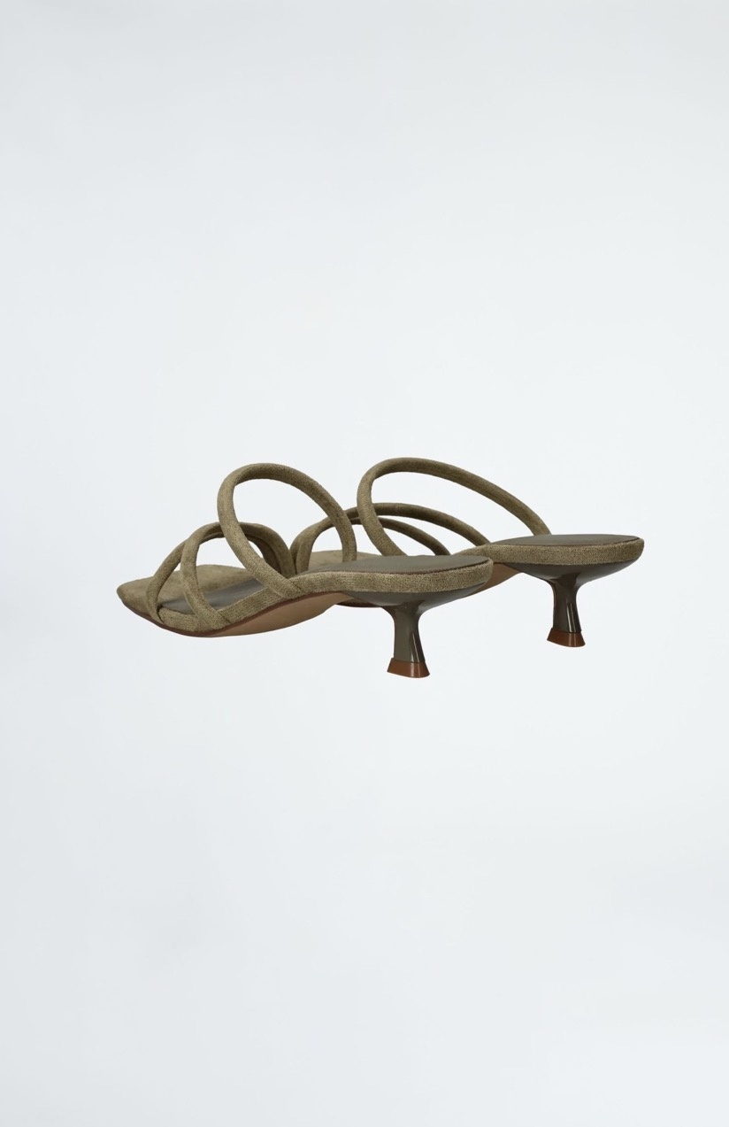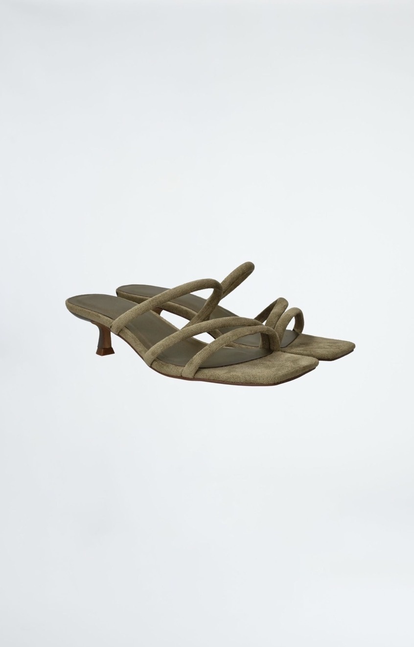 De Heeled Sandal is een elegante, minimalistische slipper met een verfijnde uitstraling. Uitgevoerd in een zachte olive tint en ontworpen met slanke, ronde bandjes die de voet subtiel omsluiten. De lage, elegante hak en de strakke vormgeving zorgen voor een vrouwelijke lijn en een moderne, tijdloze look.