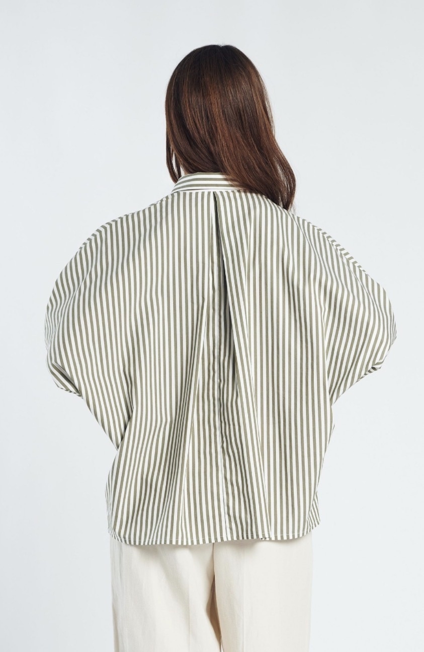 De Mara blouse is een stijlvolle essential met een moderne, ontspannen uitstraling. Het verfijnde streeppatroon in een zachte olijfgroene tint geeft de blouse een tijdloos karakter, terwijl de losvallende pasvorm zorgt voor comfort en een elegante look. De klassieke kraag en knoopsluiting aan de voorzijde maken het ontwerp clean en veelzijdig.